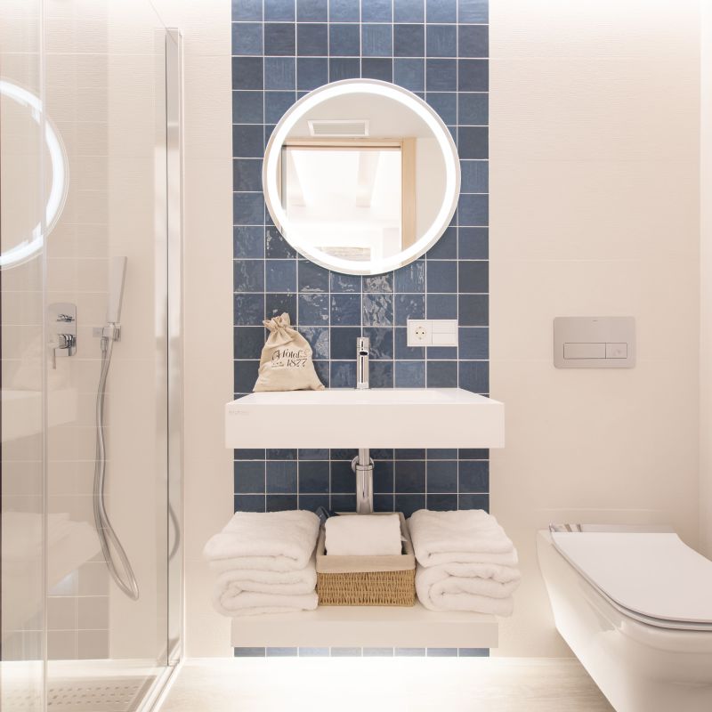 Un mundo de azuleje les recibirá en esta elegante habitación del Hotel 1877 donde el juego de texturas y la iluminación nos hará sentir cerca del mar con sus olas y la suave arena. Continuando con el juego de color y las texturas, las texturas de los tejidos se han elegido combinando colores que encajan a la perfección, dotando a esta habitación de una elegancia especial.
